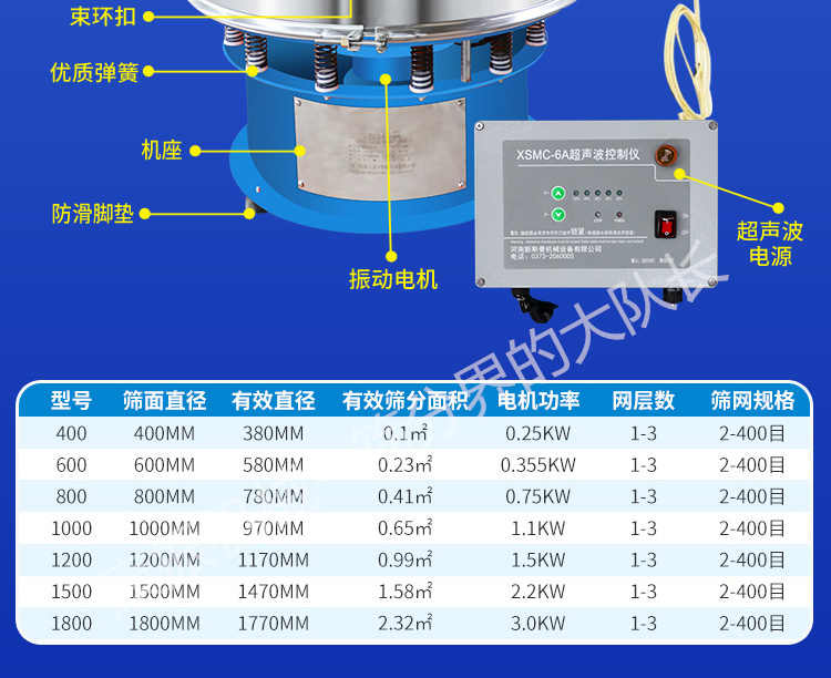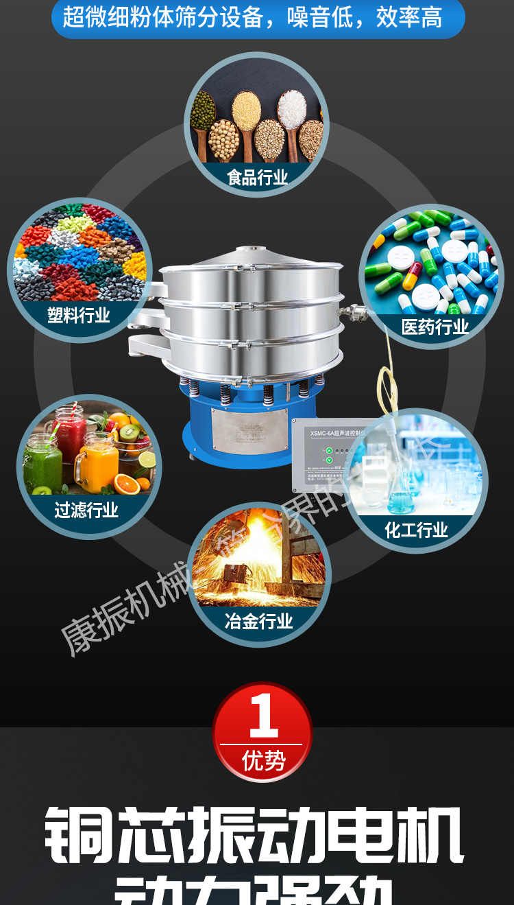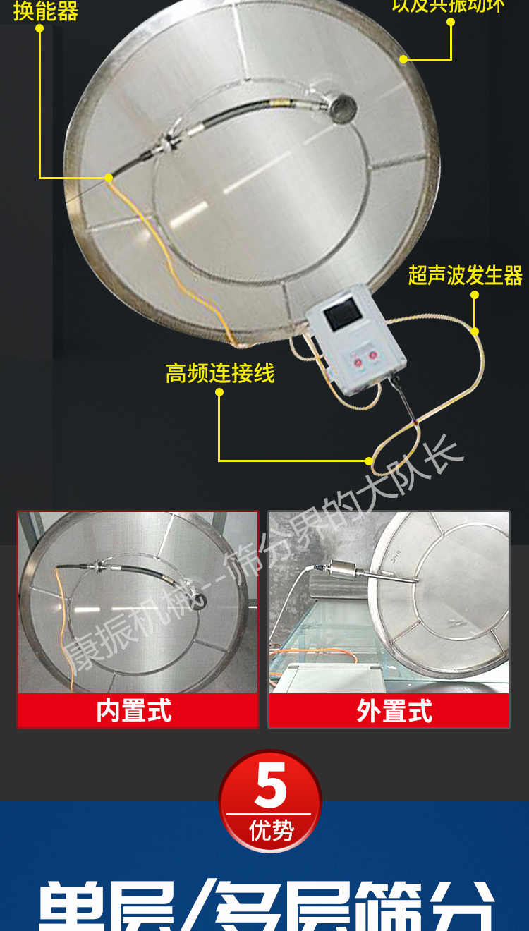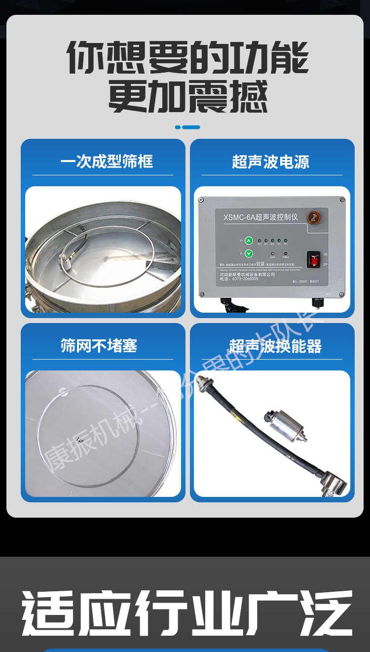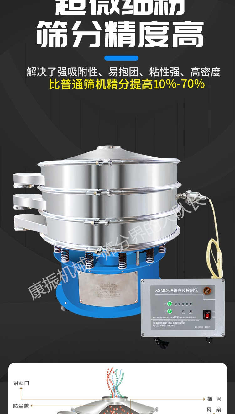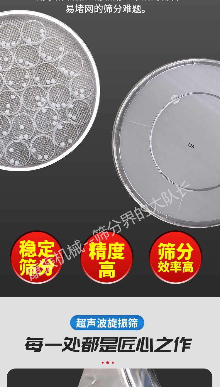 超聲波振動篩是在旋振篩的基礎上引入了超聲波清網裝置,通過將220V、50Hz或110V、60Hz電能轉化為18KHz的高頻電能,輸入超聲換能器,將其變成18KHz機械振動,從而達到高篩分和迅速清網的目的,使超微細粉篩分成為易事。該系統在傳統的振動篩基礎上在篩網上引入一個低振幅、高頻率的超聲振動波(機械波),以改善超微細粉體的篩分性能。特別適合高附加值精細粉體的用戶使用。超聲波篩分系統是一種簡單實用、可靠的篩分系統,是當前網孔堵塞的有效的解決方法。可廣泛應用于制藥、冶金、化工、選礦、食品等要求精細篩分過濾的行業,篩分過濾精度高,有效解決因團聚、靜電、強吸附性卡堵網孔等篩分難題,是國內篩分行業的一項重大技術突破。