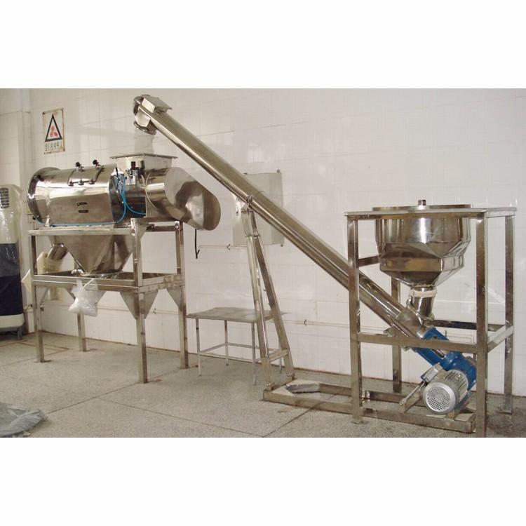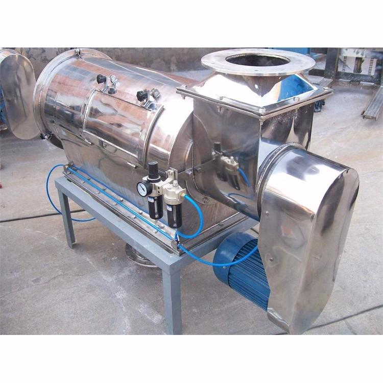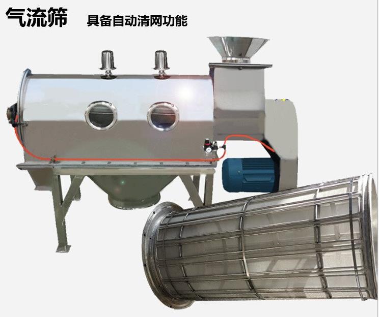 臥式氣流篩篩網為圓筒狀,置于機體內,物料通過螺旋輸送系統后,和氣流混合、霧化進入網筒內;