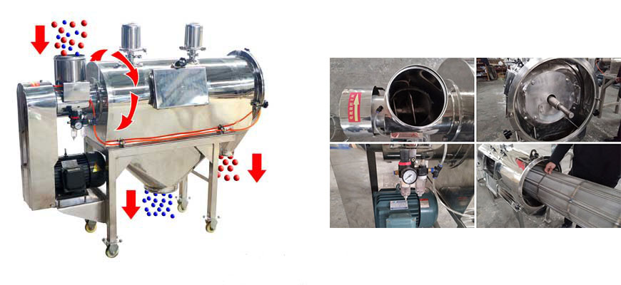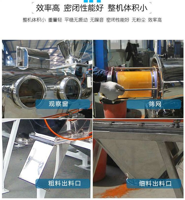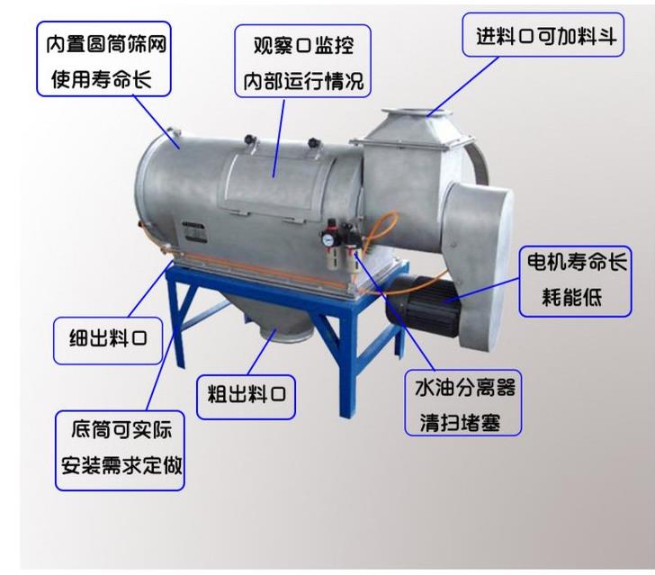 不能過網的物料沿筒壁從粗料排出口排出,達到快速分離的目的。