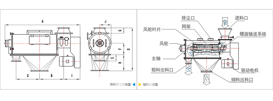 通過網筒內風輪葉片使物料同時受離心力和旋風推進力,從而迫使物料噴射過網,由細料排出口排出,不能過網的物料沿網筒壁從粗料排出口排出。