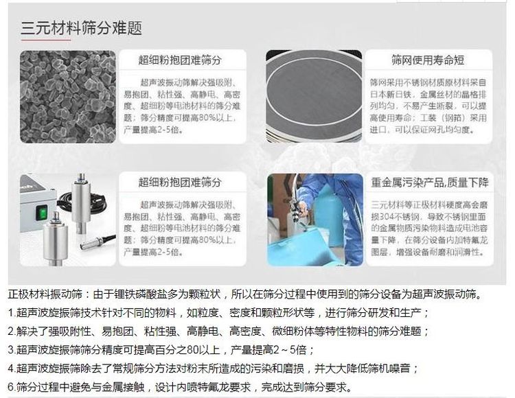 由于超聲波振動在新能源行業的**表現,在線清網效果明顯,對于比較難篩分的物料有其顯著的效果。